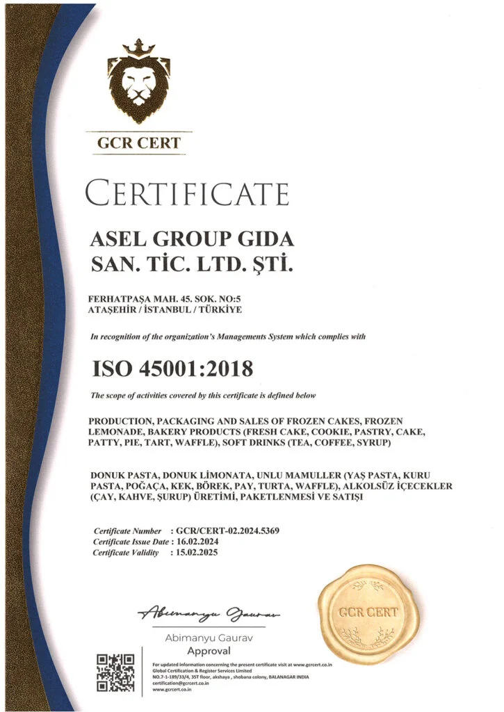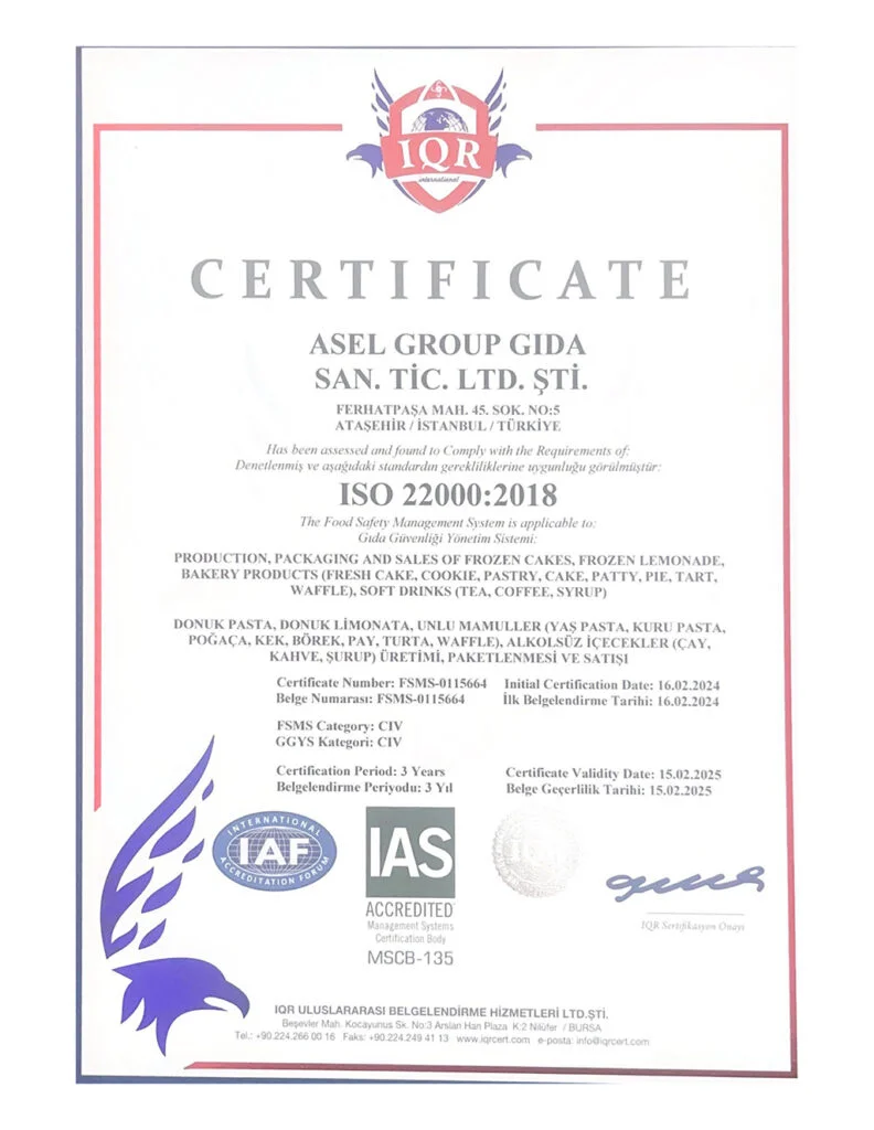 Asel Group Gıda'nın kalite ve gıda güvenliği kapsamında sahip olduğu belgeler aşağıda listelenmiştir.